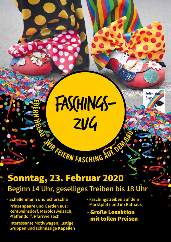 Am Sonntag, 23.02.2020 ist es wieder soweit, der Eberner Gaudiwurm schlängelt sich durch Ebern. Los geht es um 14 Uhr, mit vielen Prinzenpaaren- und garden, schmissigen Kapellen, lustigen Fußgruppen und interessanten Motivwägen.