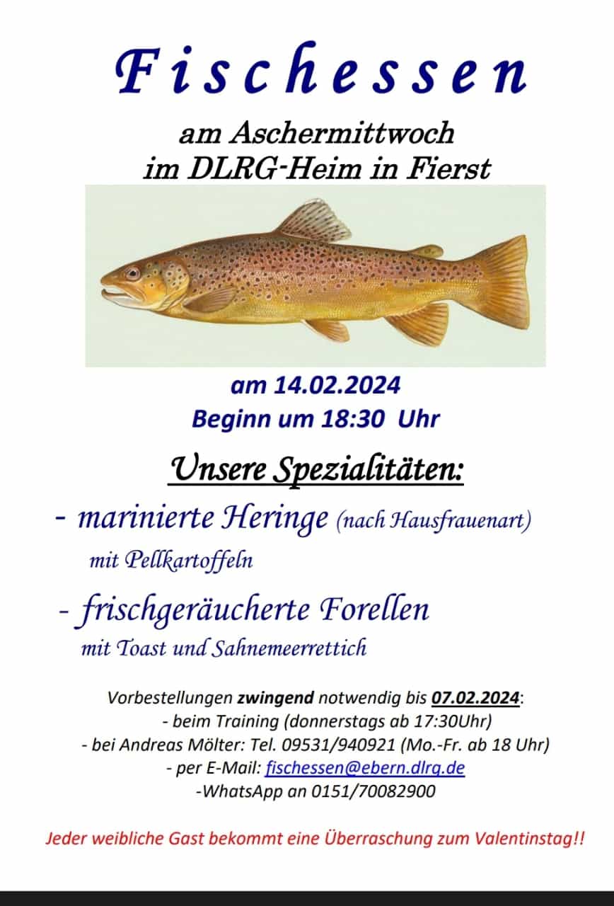 Am Aschermittwoch (14.02.24) beginnt ja bekanntlich die Fastenzeit und da es üblich ist an diesem Tag auf Fleisch zu verzichten und lieber Fisch zu essen, veranstaltet die DLRG Ebern ihr traditionelles Fischessen im DLRG-Heim in Fierst. Los geht es um 18.30 Uhr. Es wird marinierte Heringe mit Kartoffeln und frisch geräucherte Forellen geben. Eine Vorbestellung ist zwingend bis 07.02.24 notwendig. Die Vorbestellungen können beim Training (Donnerstag ab 17.30 Uhr, bei Andreas Mölter Tel. 09531/940921 (Mo-Fr. ab 18 Uhr), per WhatsApp 0151/70082900 oder per Mail: Diese E-Mail-Adresse ist vor Spambots geschützt! Zur Anzeige muss JavaScript eingeschaltet sein! aufgegeben werden.
