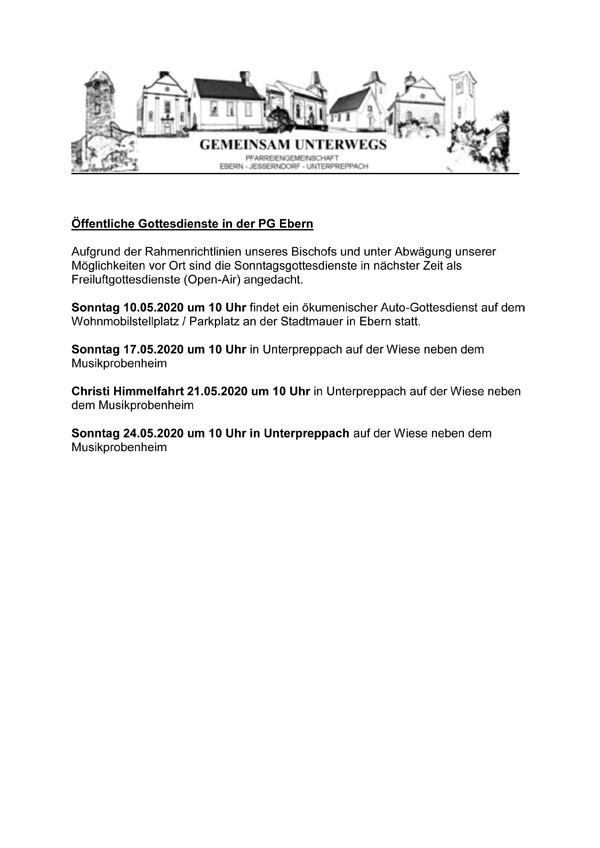 Auch für die Kirchen gibt es aktuell noch Einschränkungen wegen Corona, aus diesem Grund hält die Pfarreiengemeinschaft "Gemeinsam unterwegs" Openair Gottesdienste ab. Die genauen Termine findet ihr im Bild.