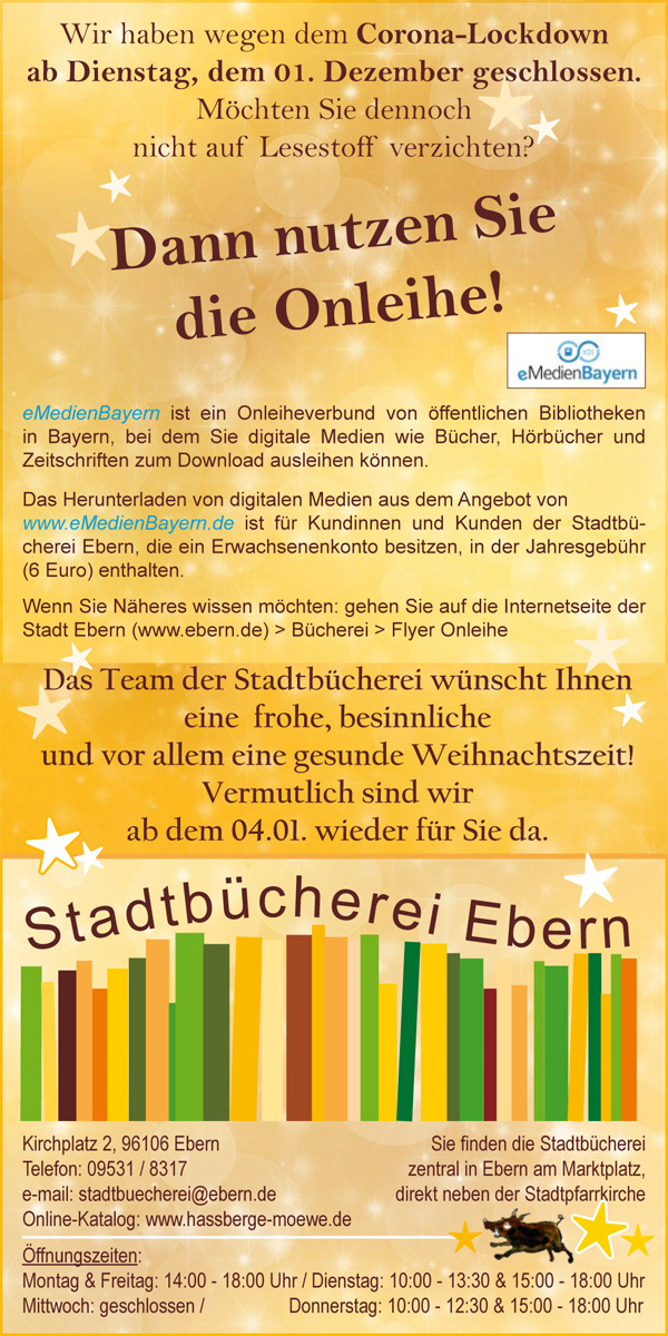 Ab morgen (01.12.2020) ist auch die Eberner Stadtbücherei vom Lockdown betroffen und muss leider schließen. Aber es muss niemand auf seinen Lesestoff verzichten. Nutzt doch einfach die Möglichkeit der Onleihe. Dieser Service ist bei der Jahresgebühr von einem (Erwachsenen) Kundenkonto dabei.