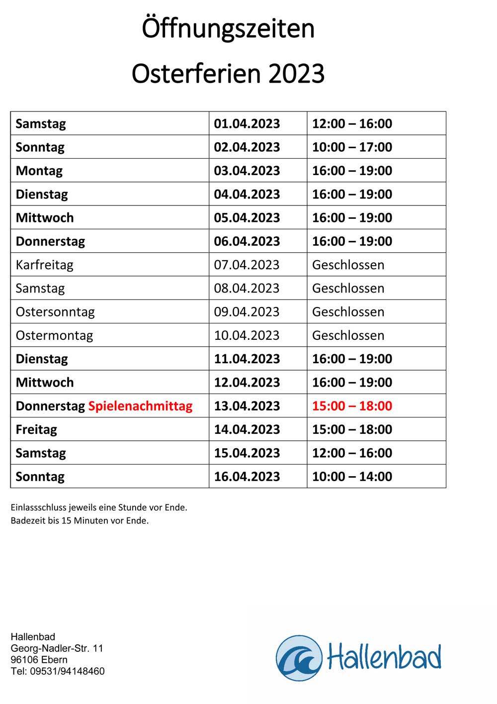 Einlassschluss ist jeweils eine Stunde vor Ende. Badezeit bis 15 Minuten vor Ende