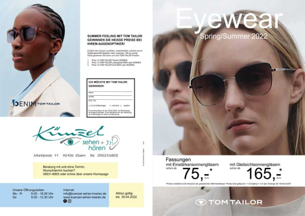 Ihr seid noch auf der Suche nach einer passenden Sonnenbrille für die erste Frühlingssonne oder den anstehenden Sommerurlaub? Dann haben wir das Richtige für euch. Wir waren in Ebern bei Künzel hören & sehen unterwegs und haben viele trendige Sonnenbrillen gefunden. Ein Gewinnspiel von Tom Tailor gibt es noch oben drauf. Schaut doch mal rein und holt euch eure Gewinnspielkarte ab, wir wünschen euch viel Glück.