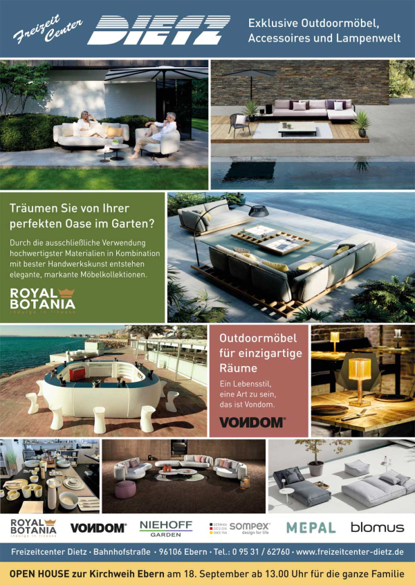 Besucht doch an der Kirchweih in Ebern das Autohaus und das Freizeitcenter Dietz und feiert den Start der neuen Ausstellung für Outdoormöbel, Accessiores und Lampenwelt. Ein Tag für die ganze Familie, denn für Unterhaltung und das leibliche Wohl ist bestens gesorgt. Es freut sich auf euren Besuch, das Autohaus & Freizeitcenter Dietz.