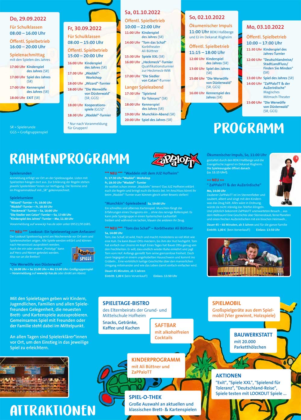 Neben einem bunten Programm mit verschiedenen Spielerunden, Aktionen und Turnieren, erwarten die kleinen und großen Spielfans auch wieder eine „Spiel-O-Thek“ mit jeder Menge Spieleneuheiten und Spieleklassikern! Das JUZ Hofheim veranstaltet einen „Waddel“-Workshop und ein „Waddel“-Turnier,  das Korbtheater Ali Büttner kommt mit dem Stück „Tom das Schaf“, es wird ein Qualifikationsturnier für die „Heckmeck“-WM veranstaltet, der Zauberer ZaPPaloTT zeigt mit seinem magischen Mitmach-Theater das Stück „ZaPPaloTT & der AuZerirdische“, der Lookout Spieleverlag wird vor Ort Spieleneuheiten zeigen, gemeinsam wird „Deutschlandreise“ gespielt,… und der Elternbeirat der Grund- und Mittelschule Hofheim sorgt für die Verpflegung!