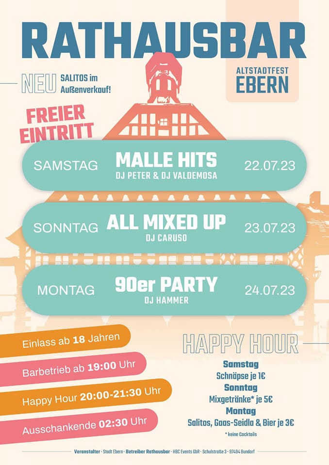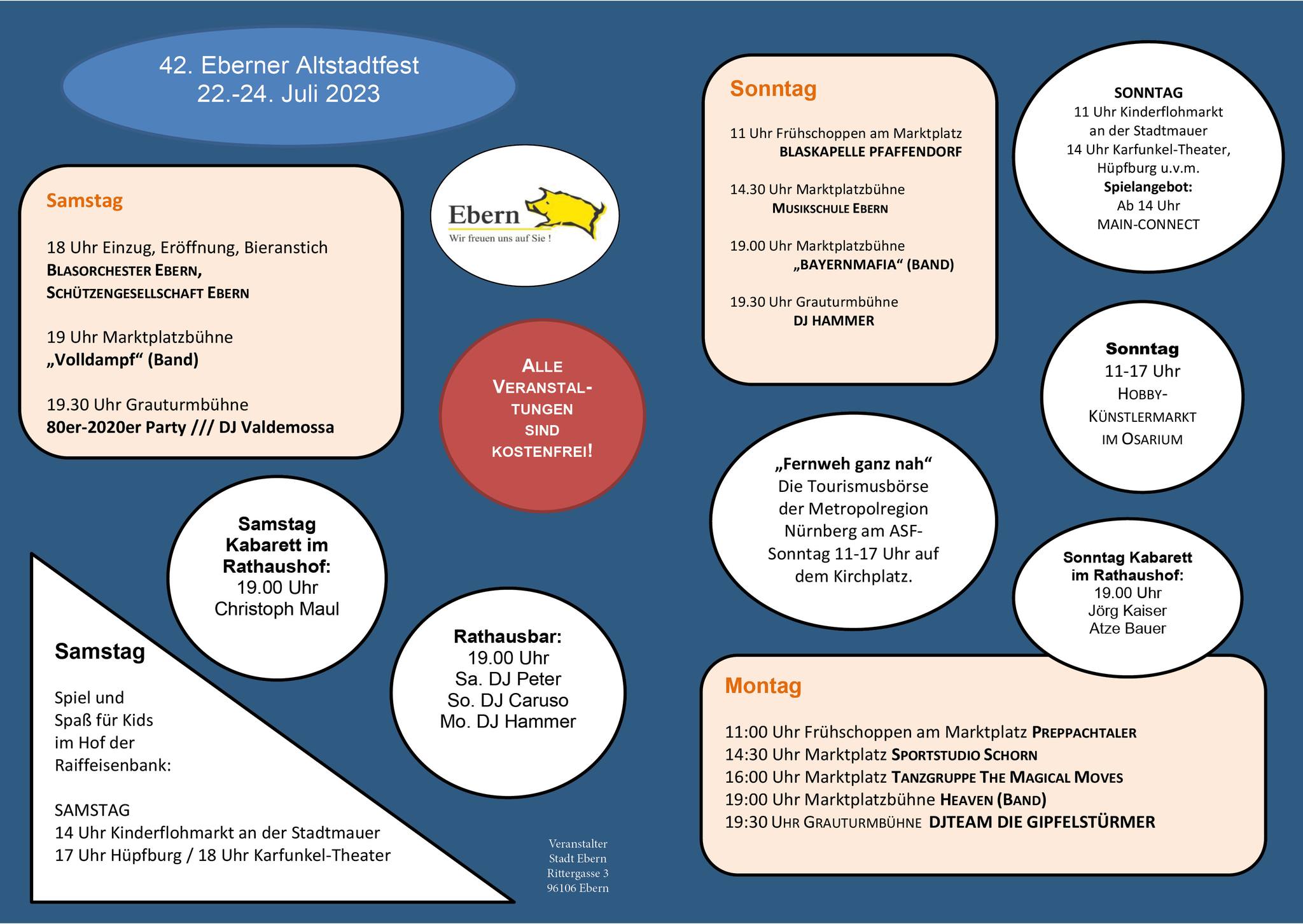 An diesem Wochenende (22. bis 24. Juli 2023) ist es wieder soweit. Die Eberner Altstadt verwandelt sich in eine Feiermeile. Hier findet ihr das Festprogramm. Kommt vorbei und habt Spaß.