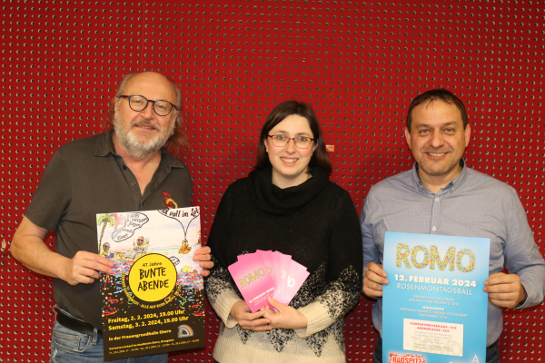 Bildunterschrift: Walter Ullrich und Janina Reuter-Schad vom Kulturring sowie Matthias Sperber vom Blasorchester (von links) läuten den Start des Kartenvorverkaufs für Bunte Abende und Rosenmontagsball ein.