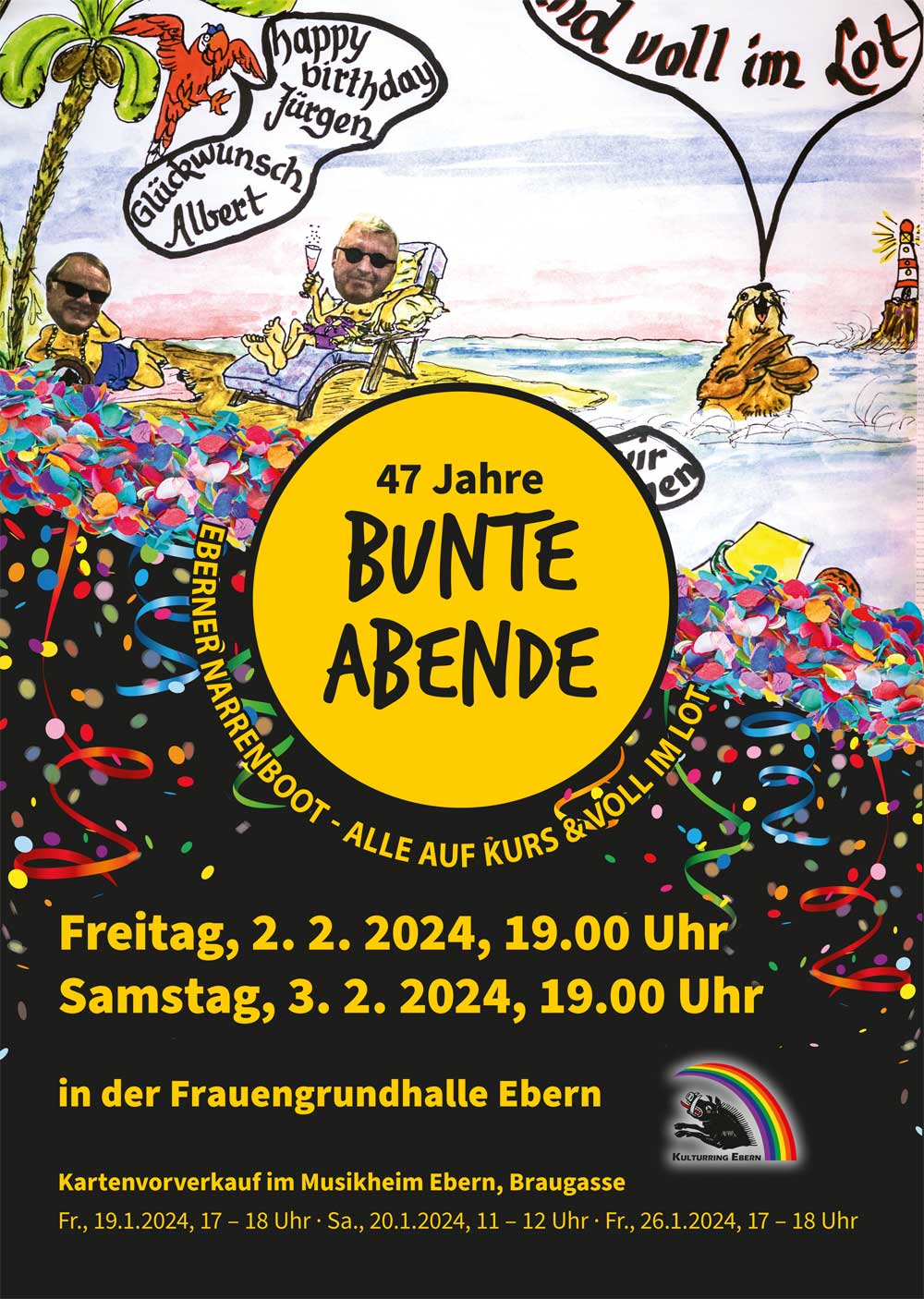 Ebern – Am Freitag, 2. und Samstag, 3. Februar 2024 sticht das „Eberner Narrenboot“ in See – dann finden nämlich jeweils um 19 Uhr in der Eberner Frauengrundhalle die 47. Bunten Abende des Eberner Kulturrings statt. Das diesjährige Motto „Eberner Narrenboot – alle auf Kurs und voll im Lot“ lässt schon erahnen, dass es an diesen Abenden maritim zugehen wird.