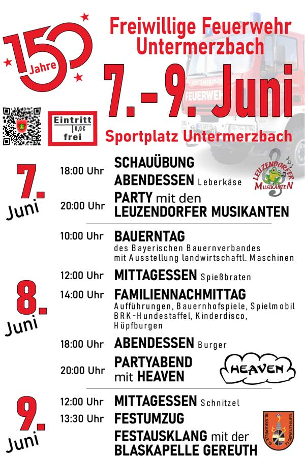 Gefeiert wird vom 7. bis 9. Juni gleich drei Tage lang – mit einem Festumzug als Höhepunkt. Los geht’s am Freitag, 7. Juni, zunächst aber erst einmal ab 18 Uhr mit einer großen Schauübung am Sportplatzgelände in Untermerzbach. Damit wird zugleich auch der diesjährige Gemeindefeuerwehrtag begangen. Die Moderation übernimmt in gewohnter Weise der federführende Kommandant der Gemeinde Untermerzbach und Kreisbrandmeister Ralph Morgenroth. Am Abend spielen die Leuzendorfer Musikanten bei freiem Eintritt auf.