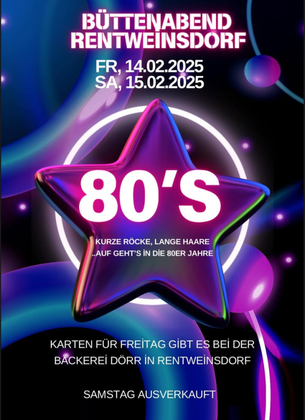 Am Freitag 14.02. und Samstag 15.02.2025 geht es in Rentweinsdorf zurück in die 80er Jahre. Unter dem Motto: "Kurze Röcke, lange Haare ...auf geht´s in die 80er Jahre" finden die Büttenabende statt.