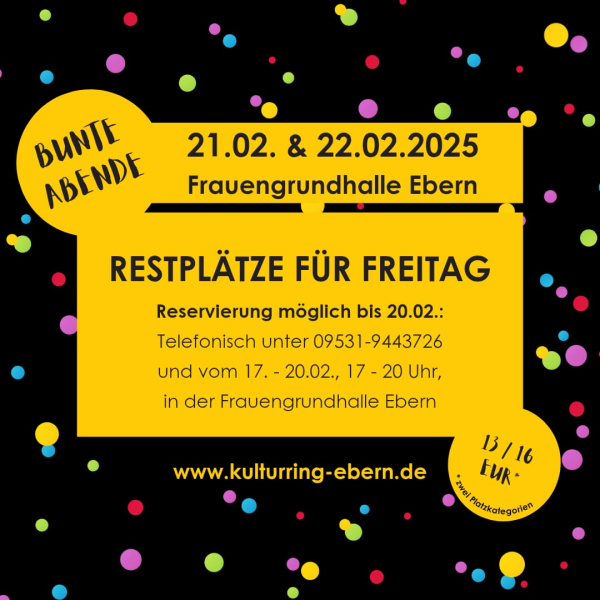 Ebern Helau – Die 48. Bunten Abende des Eberner Kulturrings am 21. und 22. Februar 2025 stehen kurz bevor. Die beiden Termine für den Kartenvorverkauf sind gelaufen und die Verantwortlichen sind überwältigt vom Ansturm. Die Veranstaltung am Samstag ist bereits ausverkauft, für Freitag, 21.02.2025 gibt es aber aktuell noch Karten (auch in den vorderen Reihen). Es besteht die Möglichkeit, unter der Rufnummer des Kulturrings (09531-9443726) Karten zu reservieren und diese dann entweder nach Vereinbarung im Büro der Musikschule (Ritter-von-Schmitt-Str. 8) abzuholen, oder sie an der Abendkasse hinterlegen zu lassen. Wer also doch noch Lust bekommen hat, die Bunten Abende zu besuchen, kann sich gerne unter der genannten Nummer melden und sich seinen Platz sichern.