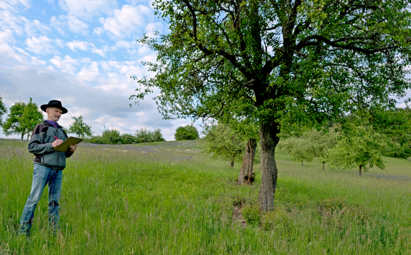 Bild: „Streuobstretter“ Stefan Paravan aus Reckendorf bei der Aufnahme und Bewertung der Obstbäume; Bildautor: Eva Paravan
