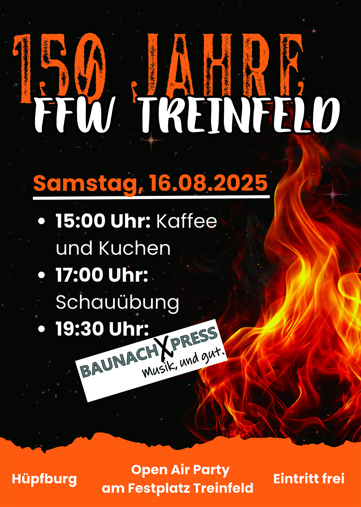 Natürlich lässt es sich auch Treinfeld nicht nehmen und lädt zu einem Fest am Samstag 16. August 2025 auf den Festplatz an der Mürsbacher Straße ein.