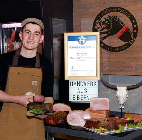 Zum ersten zertiizierten Wurst und Schinkensommelier der Region ist der Metzgermeister Kilian Fuchs aus Ebern von der Augsburger Fleischerakademie gekürt worden. Als Bester seines Kurses hat er von namhaften Koryphäen aus der Branche alles über Geschmäcker, Gerüche, Gewürze, Reifekulturen, Aromabildung, Lagerung, Hygiene, Kulturgeschichte und vieles mehr erfahren. Dies ist ein umfangreiches Wissensgebiet und viele Faktoren beeinflussen den Geschmack und die Qualität des Premiumprodukts, welches am Ende ein Hochgenuss für den Kunden sein soll. Die Kursteilnehmer aus ganz Deutschland und Österreich konnten während der Ausbilung viele Geschmacksrichtungen ausgiebig analysieren und verköstigen. Sie erhielten somit auch den Titel des Genussbotschafters.