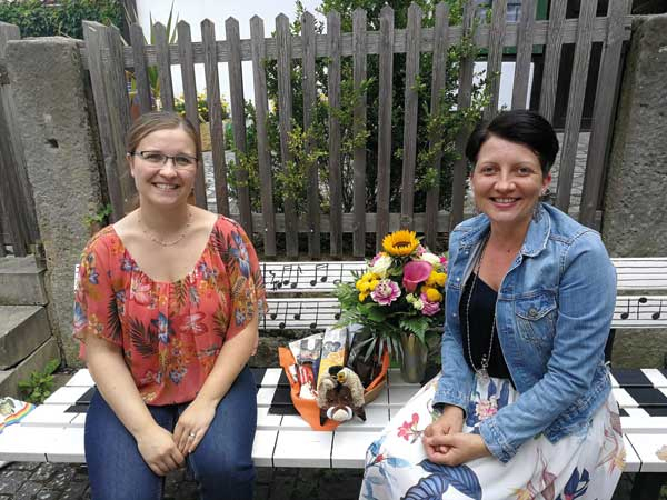 Bildunterschrift:  Die scheidende Musikschulleiterin Kristina Renner (rechts) mit der Nachfolgerin Ramona Spindler (links) auf der Notenbank an der Musikschule im Schuhmacher Haus, die vom Bauhof gestaltet wurde.