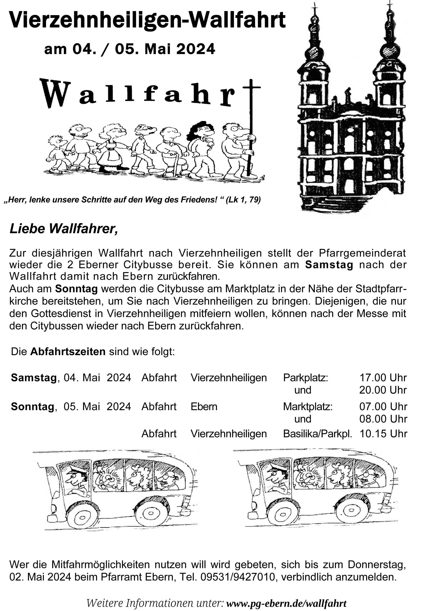Zur diesjährigen Wallfahrt nach Vierzehnheiligen (Aussendung 04.05. um 7 Uhr in der Stadtpfarrkirche) stellt der Pfarrgemeinderat diesmal wieder die 2 Eberner Citybusse bereit. Sie können am Samstag nach der Wallfahrt damit nach Ebern zurückfahren.