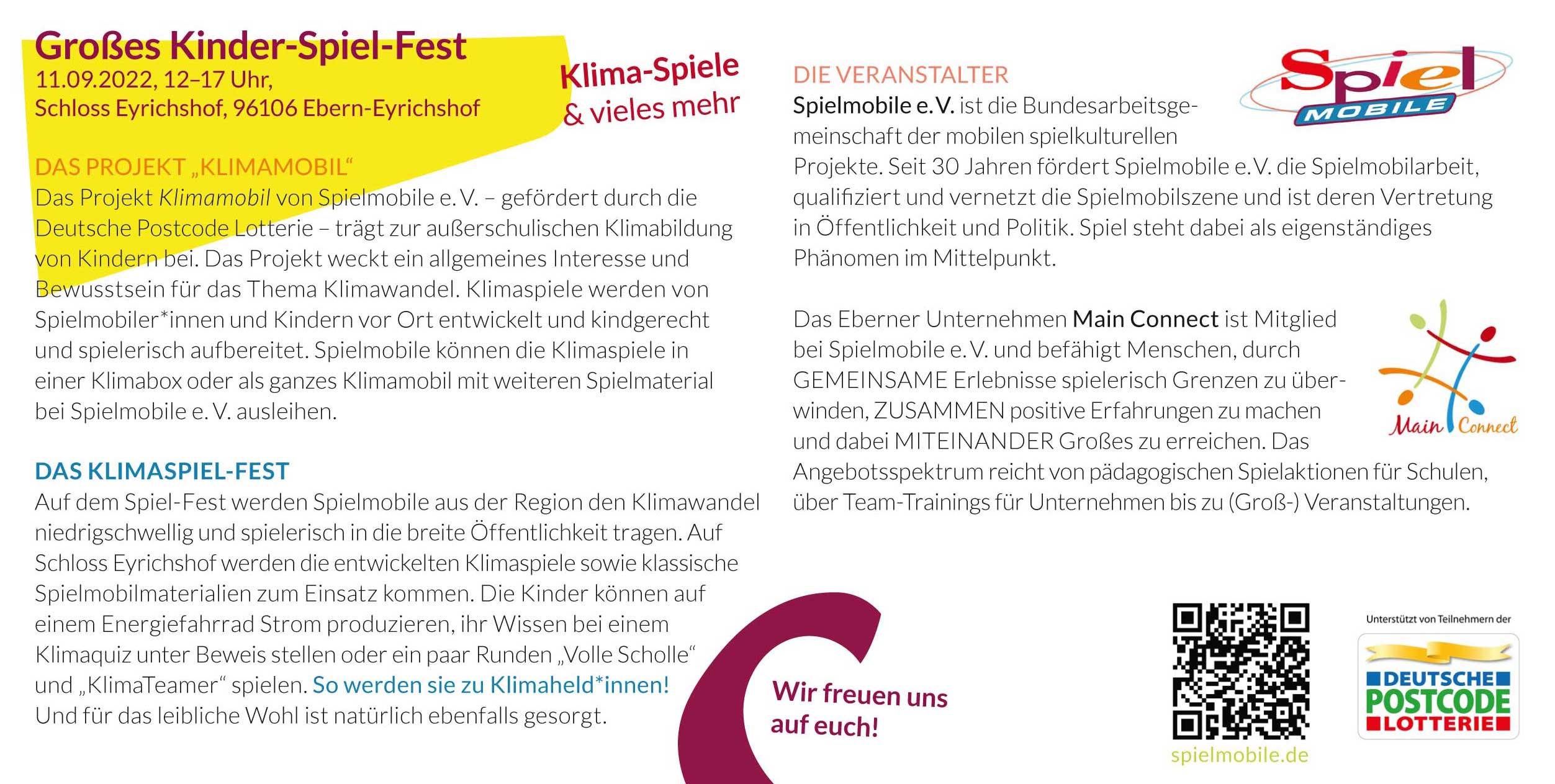 Am Sonntag 11.09.2022 findet im Rahmen eines Kinder-Spiel-Festes in Schloss Eyrichshof, die Übergabe seines Klimamobils statt. Der Spielmobilverband lädt alle Kinder mit ihren Eltern recht herzlich ein die Klimaspiele und vieles mehr zu erleben, der Eintritt ist frei. Auf viele Teilnehmer freut sich der Spielmobilverband und die Main Connect (bekannt von zahlreichen Eberner Veranstaltungen)