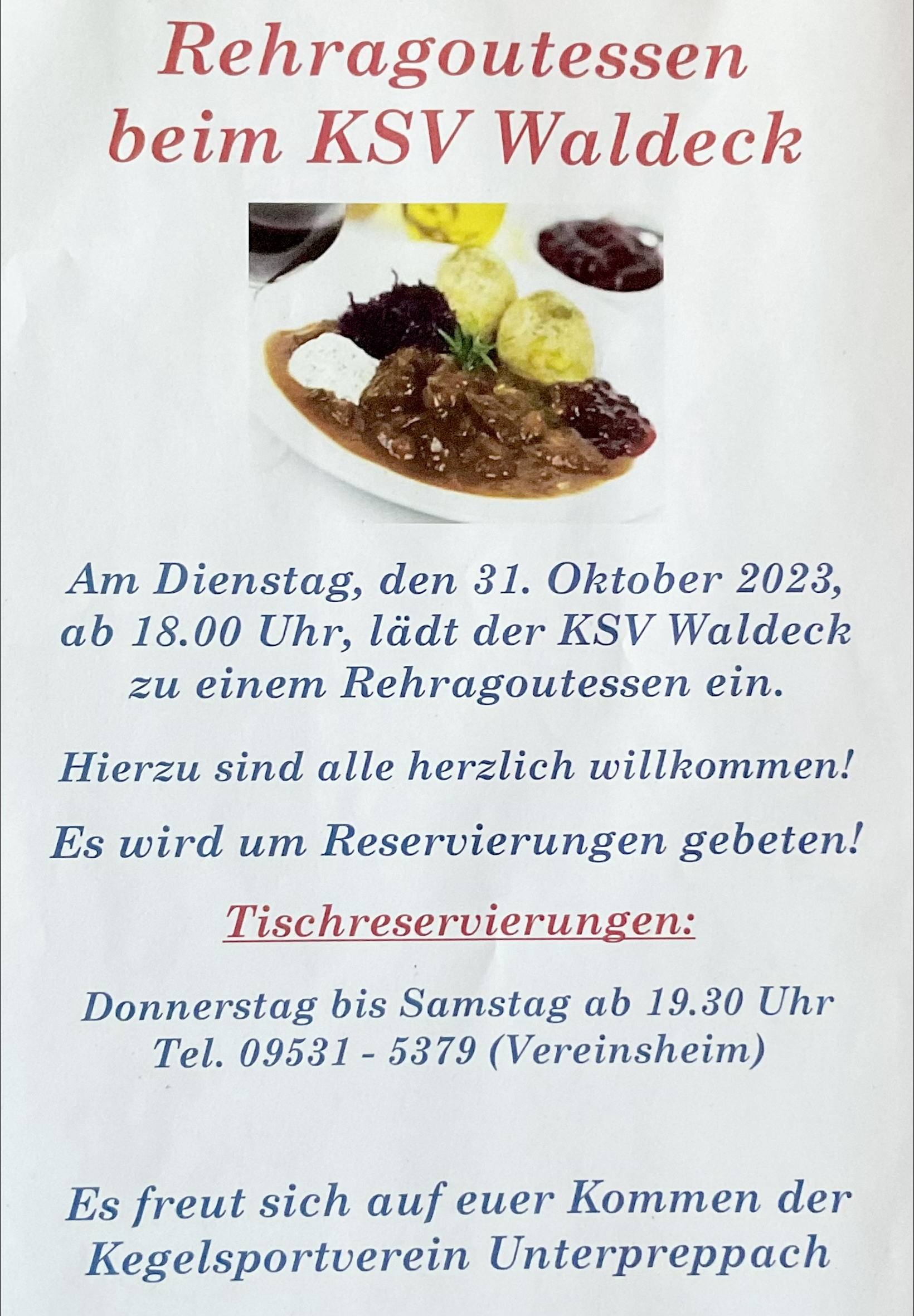 Das traditionelle Rehragoutessen des KSV Waldeck findet am Dienstag 31.10.2023 ab 18 Uhr im Vereinsheim (Kirchklingenweg 7, Unterpreppach) statt. Reservierungen unter 09531/5379 (Do. bis Sa. ab 19.30 Uhr) erwünscht. Über zahlreiche Gäste freut sich der KSV Waldeck