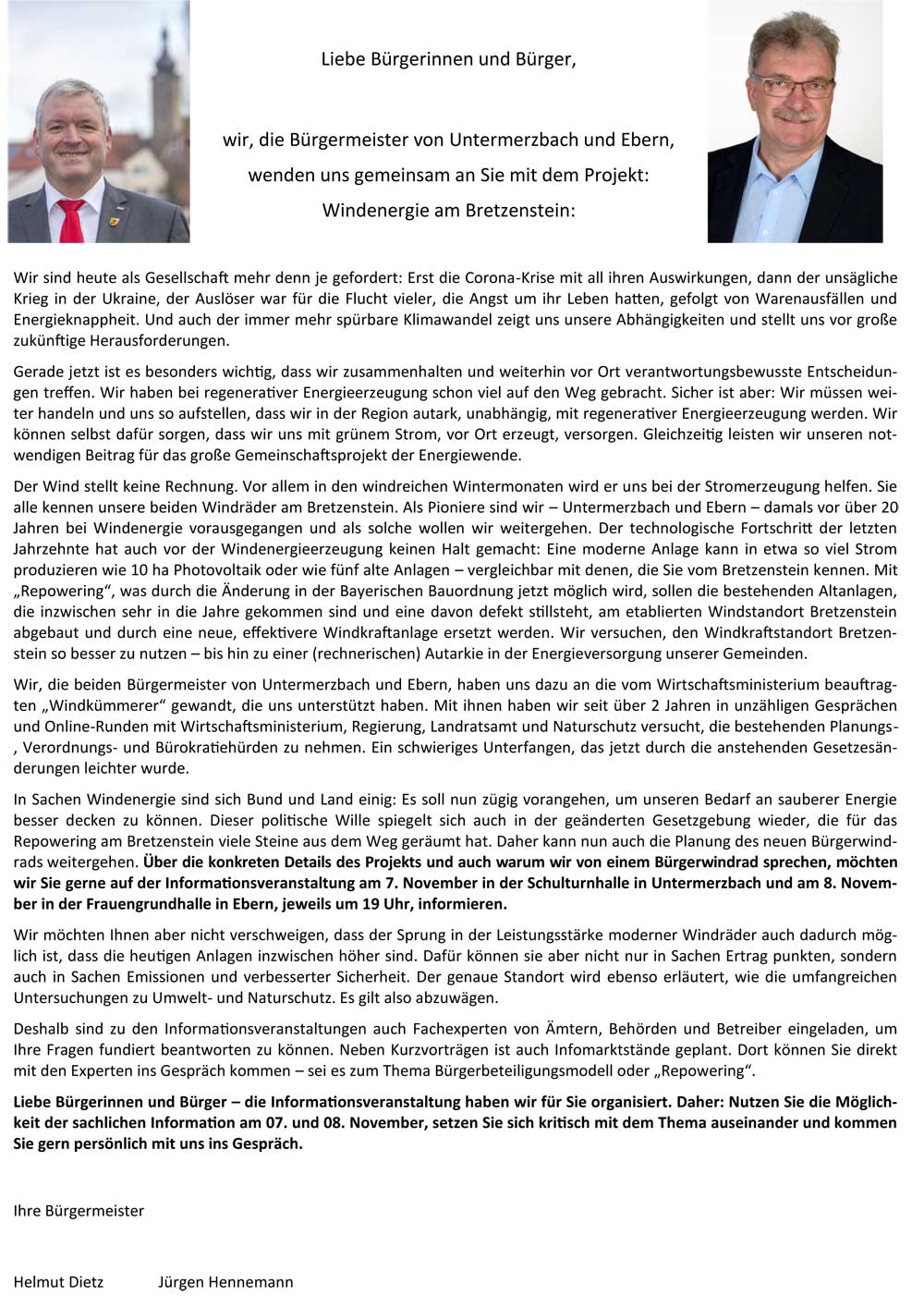 Der Ausbau der Windenergie kann auch in Untermerzbach und Ebern ein Baustein sein, um dem Klimawandel entgegenzutreten und die regionale Energieversorgung zu sichern. Die beiden Kommunen möchten ihre Bürgerinnen und Bürger zum interkommunalen Bürgerwindradprojekt am Bretzenstein informieren. Dazu haben sie zwei Informationsveranstaltungen am 7. sowie 8. November organisiert. Unterstützung erhalten die Kommunen von den Windkümmerern Unterfranken, die im Auftrag des Bayerischen Staatsministerium für Wirtschaft, Landesentwicklung und Energie die Umsetzung von Windenergieprojekten an verträglichen Standorten vorantreiben sollen.