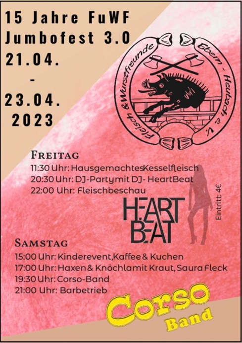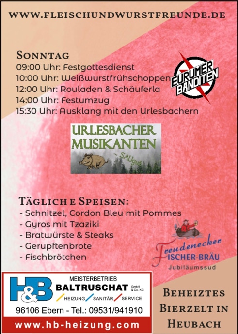 Neben Livemusik der Corso-Band, den Eurumer Banditen, den Urlesbacher Musikanten sowie einer DJ-Party mit Barbetrieb und Fleischbeschau gibt es natürlich an allen Tagen leckere Schmankerl, wie hausgemachtes Kesselfleisch oder Hax´n. Als Höhepunkt zieht am Sonntag der Festzug mit vielen Vereinen und Gruppen durch Heubach bevor die Fleisch- und Wurstfreunde ihr Jubiläum mit Blasmusik im Festzelt gemütlich ausklingen lassen.