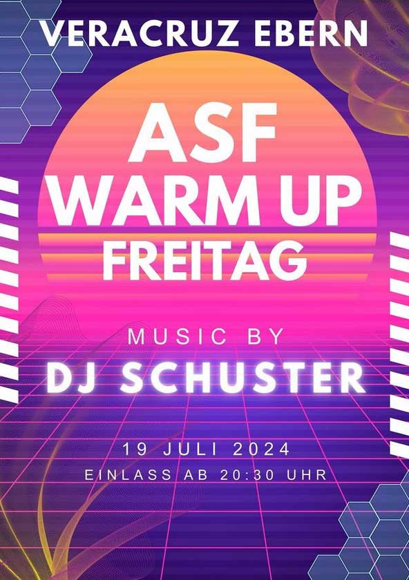 Auch heuer bietet euch das mexikanische Restaurant Veracruz auf dem Eberner Marktplatz einen ASF Warmup. Am Freitag 19.07.24 ab 20.30 Uhr sorgt DJ Schuster für super Stimmung.