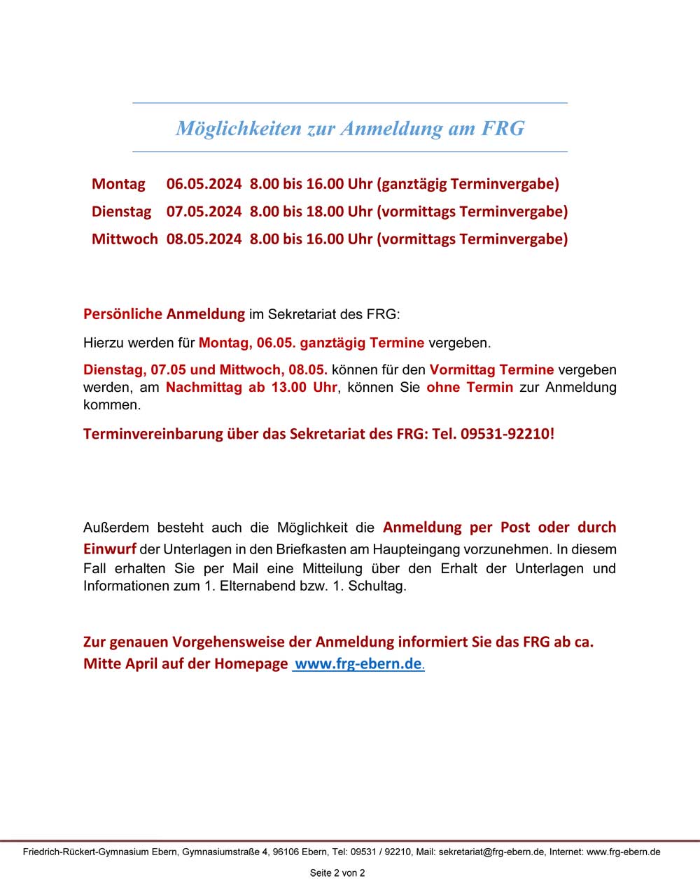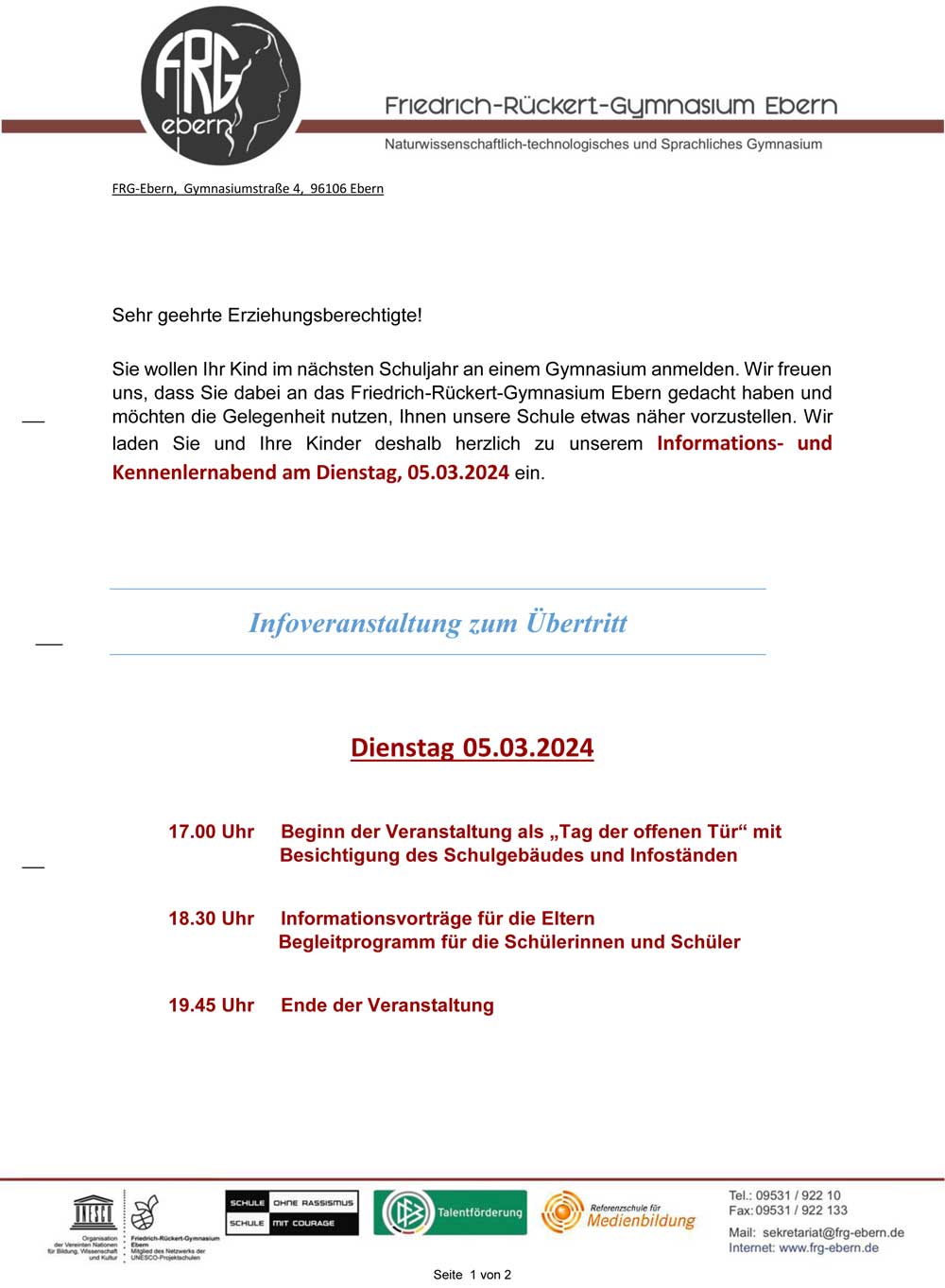 Es geht wieder auf den Zwischenbericht der 4. Klässer zu und somit auch auf die Frage, welche weiterführende Schule besucht mein Kind in Zukunft? Sie wollen Ihr Kind im nächsten Schuljahr am Eberner Friedrich-Rückert-Gymnasium Ebern anmelden oder einfach mal alle Möglichkeiten abchecken. Dann merkt euch gerne mal den Termin zum Infoabend des FRG am Dienstag den 05.03.2024 ab 17 Uhr vor.