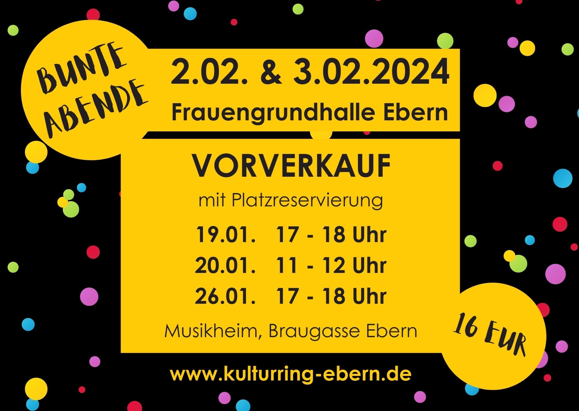 Am Freitag, 19. und 26. Januar 2024 von jeweils 17 bis 18 Uhr sowie am Samstag, 20. Januar 2024 stehen die Verantwortlichen im Musikprobenheim in der Braugasse Ebern bereit, um die beliebten Eintrittskarten an den Mann bzw. die Frau zu bringen. Für die Bunten Abende kann man sich direkt die Sitzplätze auswählen. Für den Rosenmontagsball werden auch Tischreservierungen entgegengenommen.
