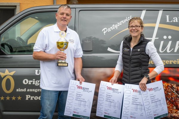 Rainer Hümmer und Marion Müller durften neben den Urkunden für die ausgezeichneten Fränkische Bratwürste, Grobe Bratwürste, Schweinerückensteak und Schweinekammsteak den Grillpokal 2024 beim Metzger Cup BBQ für Ihre hervorragenden, hochwertigen und prämierten BBQ Produkte entgegennehmen.