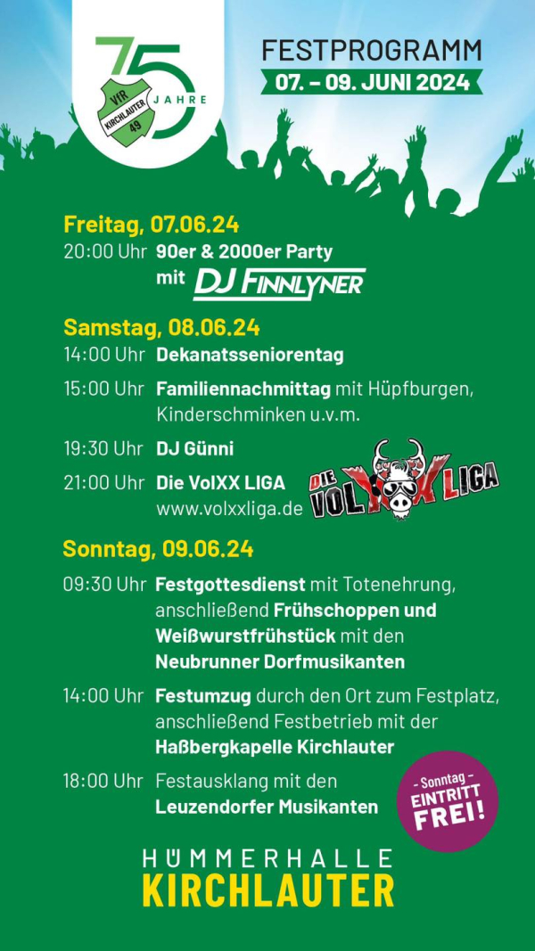 Zum 75. Jubiläum lässt es der VfR Kirchlauter richtig krachen. Ein buntes Festprogramm wartet auf euch. Vom 07. bis 09. Juni 2024 geht es in der Hümmerhalle rund.