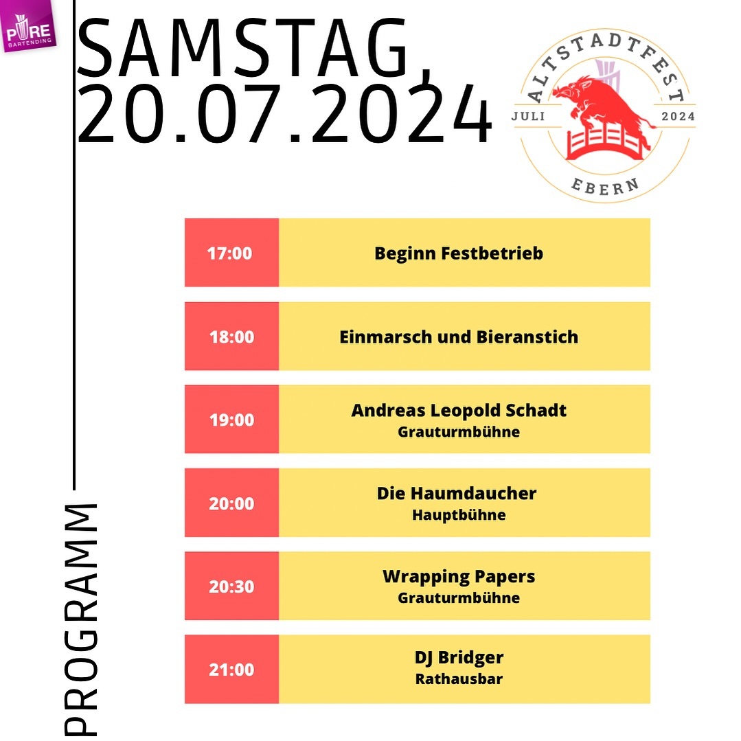 Der Startschuss fällt am Samstag um 17 Uhr mit dem offiziellen Beginn des Festbetriebs. Um 18 Uhr folgt der traditionelle Einmarsch und Bieranstich durch Bürgermeister Jürgen Hennenmann. Auf der Grauturmbühne sorgt ab 19 Uhr Comedian Leopold Schadt für Unterhaltung, während die Band Haumdaucher ab 20 Uhr die Hauptbühne rockt. Parallel dazu treten um 20:30 Uhr die Wrapping Papers auf der Grauturmbühne auf. Ab 21 Uhr heizt DJ Bridger in der Rathausbar die Stimmung weiter an.