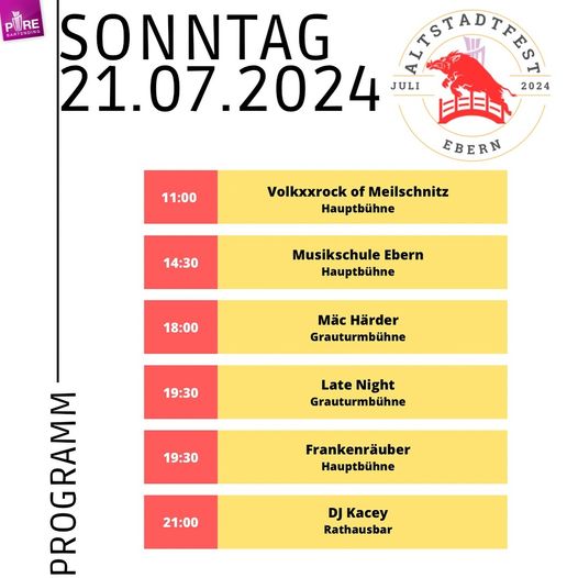 Der Sonntag beginnt musikalisch um 11 Uhr mit Volkxxrock Meilschnitz auf der Hauptbühne. Am Nachmittag zeigt die Musikschule Ebern ab 14.30 Uhr ihr Können. Am Abend erwartet die Besucher ein vielfältiges Programm: Mäc Härder tritt um 18 Uhr auf der Grauturmbühne auf, gefolgt von Band Late Night um 19 Uhr. Zur gleichen Zeit spielen die Frankenräuber auf der Hauptbühne. DJ Kacey sorgt ab 21 Uhr in der Rathausbar für die passenden Beats.