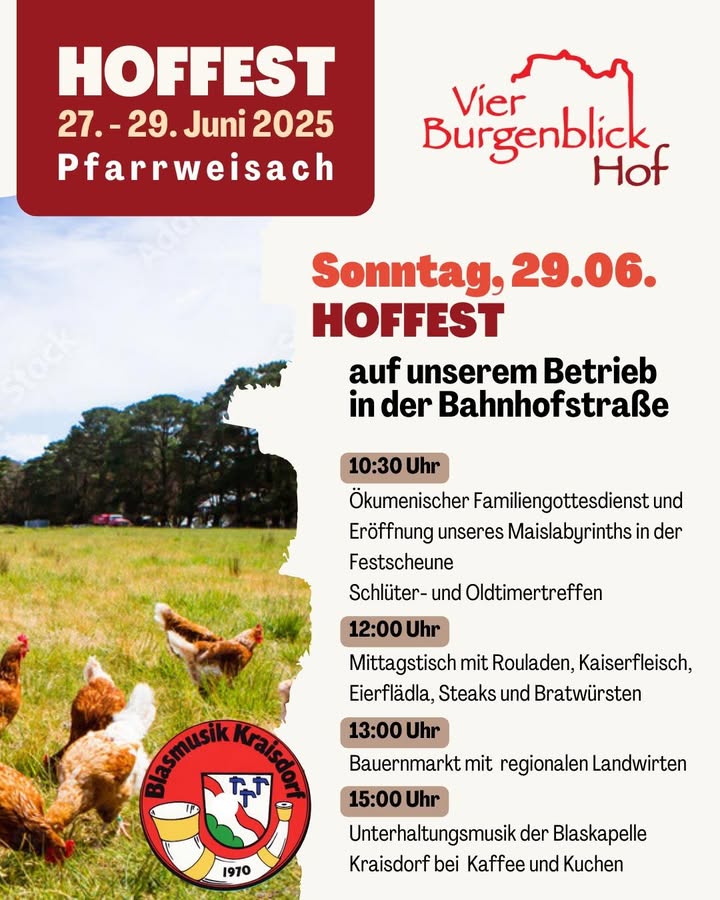 Einladung zum Hoffest des Vier-Burgenblick Hofs in der Bahnhofstraße 27, 96176 Pfarrweisach vom 27. - 29. Juni 2025