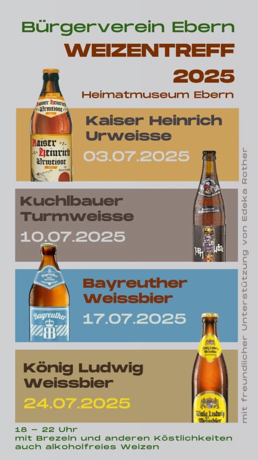 Die schönste Zeit des Jahres naht und auch wir stehen für euch wieder in den Startlöchern. Mit besonderer Vorfreude auf einen schönen Sommer lädt der Bürgerverein Ebern wieder in den Museumshof ein. Dort gibt es an den vier Donnerstagen vor dem Altstadtfest von jeweils 18 bis 22 Uhr wieder eine hefige Erfrischung in gemütlicher Atmosphäre. Dazu werden wie immer Brezeln und kleine Verköstigungen am Tisch gereicht sowie auch alkoholfreie Weizen angeboten.