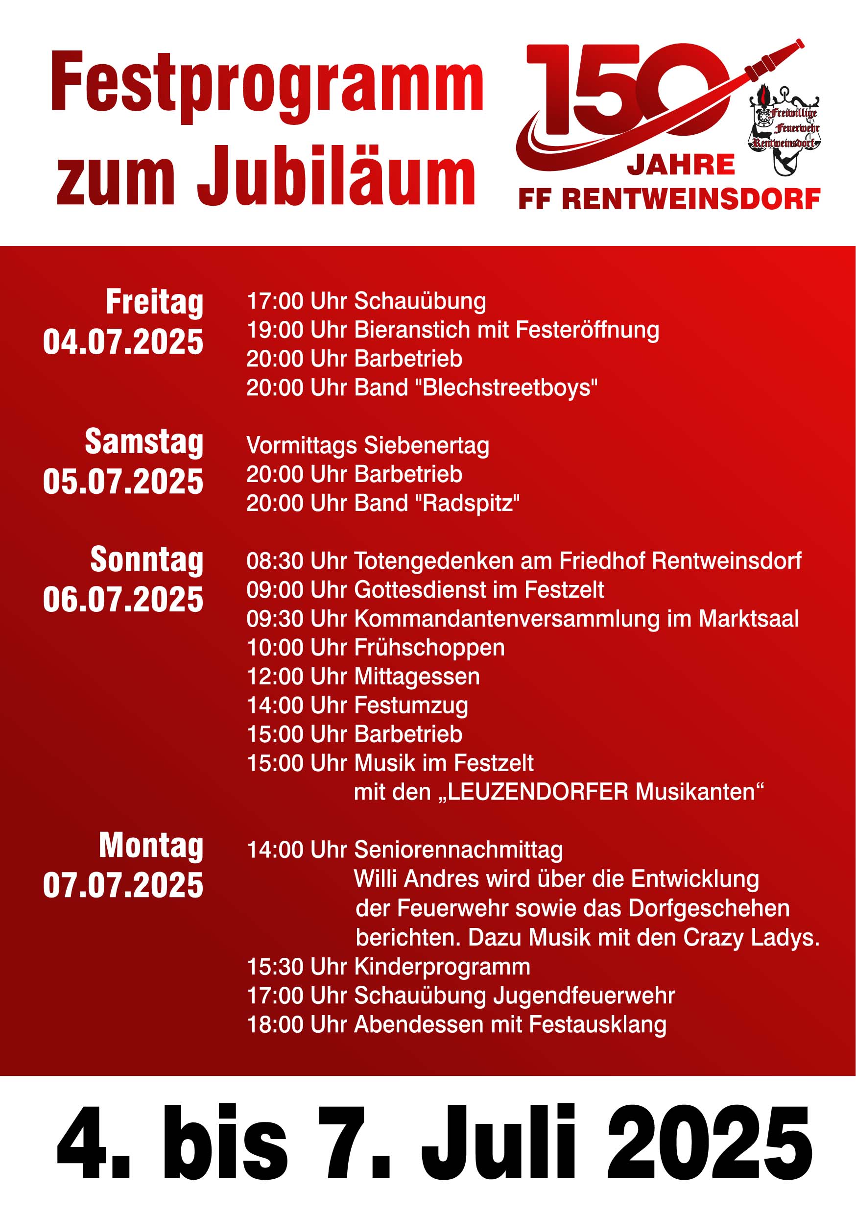 Das 150-jährige Jubiläum der FFW Rentweinsdorf bietet ein buntes Programm für jung und alt: